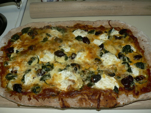 Déposer les tranches de courgettes, les morceaux d'épinards, les olives et la mozzarella par dessus. Puis couvrir de fromage. Un petit coup de moulin a poivre et hop au four pour 25-30mn ou jusqu'à ce que le dessus soit bien dore.